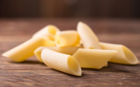 pasta penne on rustic wooden table