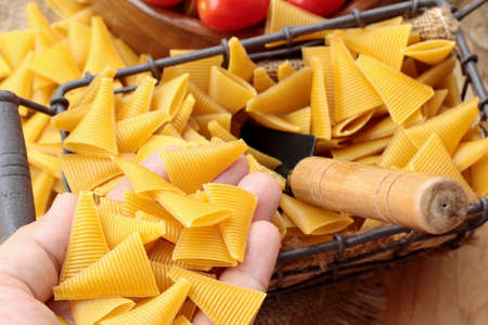 background of traditional italian uncooked pasta in the kitchen