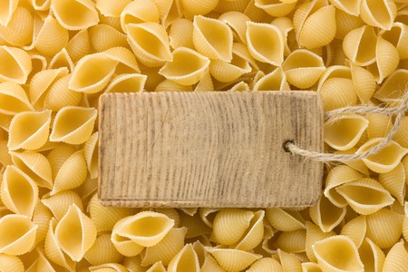 raw pasta and price tag as background
