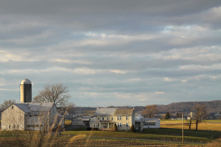 Amish country, farm, home and barn on field agriculture in Lancaster, Pennsylvania, PA US North America