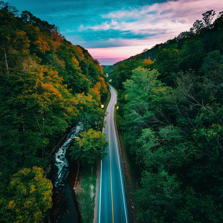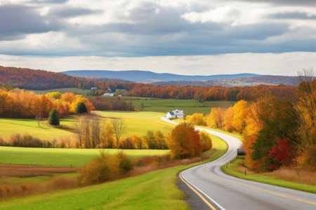 scenic highway, with view of rolling hills and farmland, surrounded by autumn colors, created with generative ai