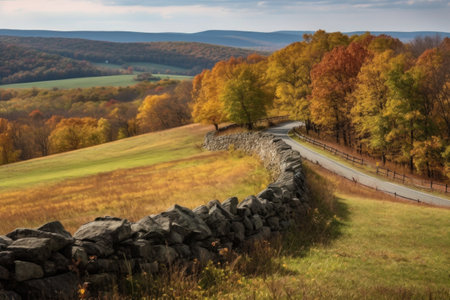 rolling hills with stone wall fence, winding through the landscape, created with generative ai