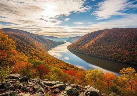 A serene river winds through a valley surrounded by vibrant autumn foliage under a blue sky