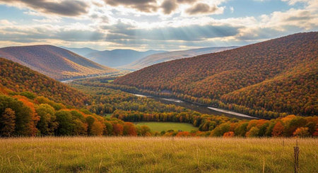 A serene landscape of rolling hills and mountains with a river flowing through a valley during autumn