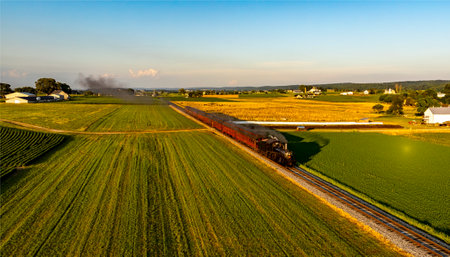 A steam train chugs along the tracks, billowing smoke into the evening sky as it passes through vibrant green and golden fields, creating a scenic rural backdrop.