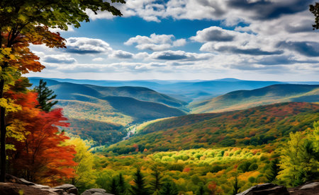 Autumn mountain landscape with colorful forest on foreground and blue sky with clouds