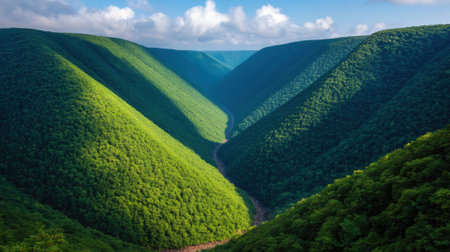 A sunlit green mountain valley framed by forested ridges and deep ravine under blue sky