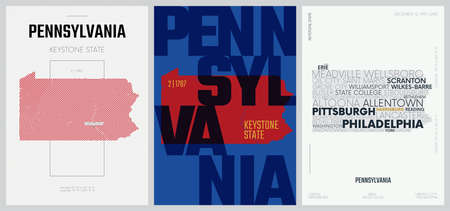 2 of 50 sets, US State Posters with name and Information in 3 Design Styles, Detailed vector art print Pennsylvania map
