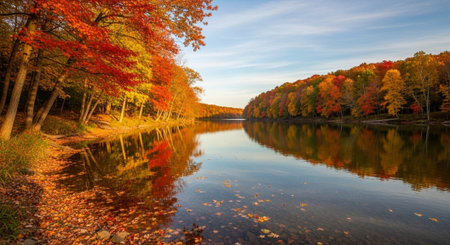 A serene landscape of a river flowing through a valley surrounded by vibrant autumn trees and mountains