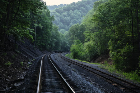 A tranquil scene of a railway winding through a lush autumn forest, with the contrast of coal-covered tracks against the vibrant fall foliage