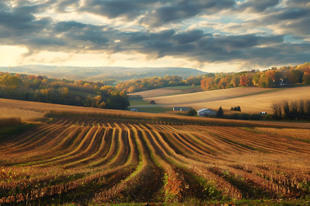 Rural landscape with barns and wheat field in the fall.