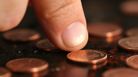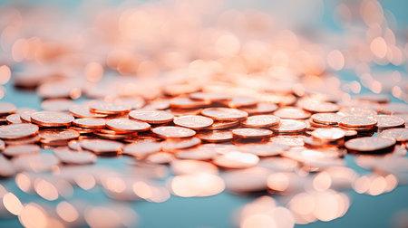 A visually captivating close-up of shiny copper coins scattered on a surface, featuring blurred background and soft light reflections, ideal for finance themes.