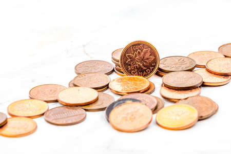 Lucky pennies on a marble top. Calgary, Alberta, Canada