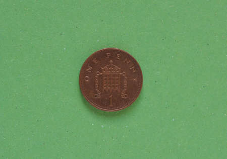 1 penny coin money (GBP), currency of United Kingdom over green background