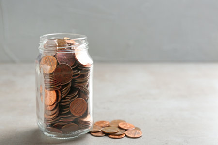 High-key finance scene with a clear jar positioned behind rows of shiny coins.