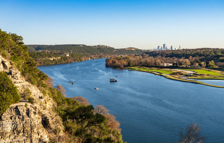 Golf course lines the Colorado river with downtown Austin Texas in distance from Pennybacker bridge overlook