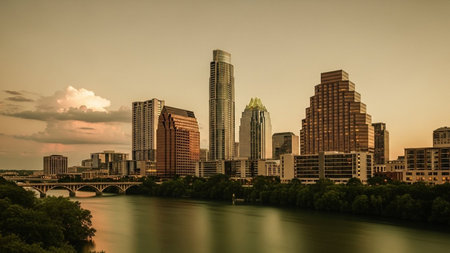 The Austin, Texas skyline is captured in the warm, soft light of sunset. Tall, modern skyscrapers rise above a lush green treeline, with their golden facades reflecting the fading sunlight. The Colorado River flows gently in the foreground, its surface mirroring the cityscape and the sky. A bridge spans the river, connecting the urban center to the surrounding landscape. The overall scene is serene and picturesque, showcasing the blend of urban development and natural beauty.