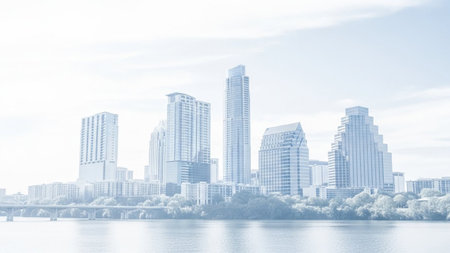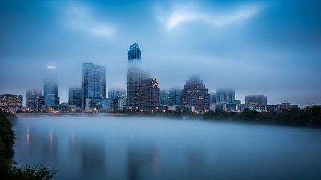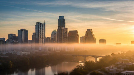 The vibrant Austin, Texas skyline rises majestically from a thick blanket of morning fog, partially obscuring the lower buildings and creating an ethereal, dreamlike atmosphere. The Colorado River flows calmly in the foreground, reflecting the soft hues of the sunrise. A prominent bridge spans the water, connecting the urban landscape. Modern skyscrapers and diverse architectural styles define the city's impressive silhouette against a sky painted with soft blues, yellows, and oranges....