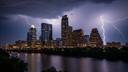 A dramatic night scene captures a powerful lightning storm raging over a modern city skyline. Jagged bolts of lightning illuminate the dark, cloudy sky, casting a stark contrast against the illuminated windows of numerous skyscrapers. The city's lights twinkle below, reflected in the dark water of a river in the foreground, creating a dynamic and intense urban landscape.