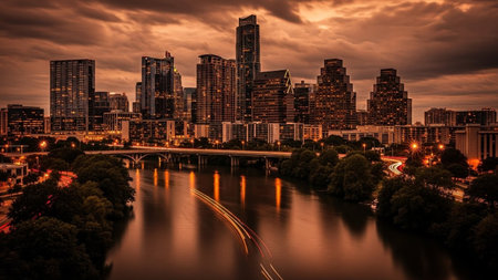 A panoramic view of the Austin, Texas skyline bathed in the warm, vibrant hues of a sunset. The sky is a canvas of orange and gold, with scattered clouds adding texture. The Colorado River flows serenely in the foreground, reflecting the city lights and the colorful sky. Lush green trees line the riverbanks, contrasting with the modern architecture of the skyscrapers that dominate the urban landscape. The scene evokes a sense of tranquility and the beauty of a city at dusk.