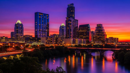 The Austin skyline is dramatically illuminated against a vibrant twilight sky painted with deep purples and fiery oranges. Tall modern skyscrapers rise above the cityscape, their windows glowing with artificial light. A wide river flows in the foreground, its surface mirroring the colorful sky and the city's lights, creating a visual reflection. A bridge spans the water, further connecting the urban landscape. The scene captures the serene beauty of the city at dusk, showcasing its dynamic...