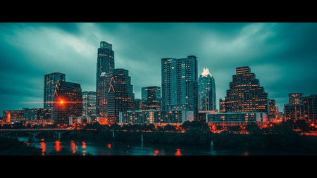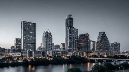 The vibrant Austin, Texas skyline is captured at dusk, with its modern skyscrapers illuminated against the darkening teal sky. The city lights create a spectacle, beautifully reflected in the calm waters of the river flowing in the foreground. Lush trees line the riverbanks, adding a touch of nature to the urban panorama. showcases the dynamic energy and beauty of the city at night.