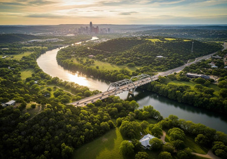 The vibrant Austin, Texas skyline is captured at sunset, bathed in the warm glow of golden hour. The Colorado River flows gracefully through the scene, reflecting the colorful sky and the modern architecture of the city's skyscrapers. Lush green trees line the riverbanks, adding a touch of nature to the urban landscape. Clouds dot the clear blue sky, enhancing the picturesque panorama of this dynamic cityscape.