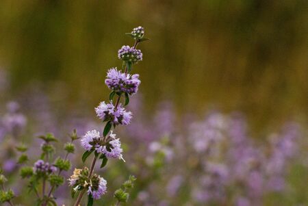 Pennyroyal Mint Mentha pulegium, herbs, medicinal plant . Closeup of medicinal plant on a blurred background. Top view. The Plant is a wild plant of meadows and pastures.