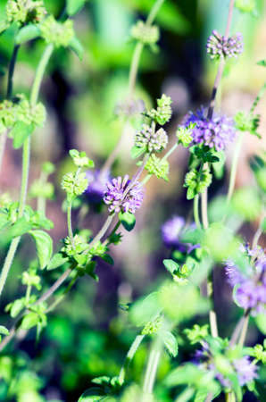 herb bush, blooming peppermint mint at sunset, background with free copy space