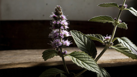 Close-up of a mint plant with purple flowers in bloom, set against a dark wooden background.