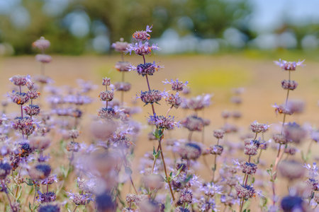 Oregano flowers top view. Blooming wild oregano in the meadow