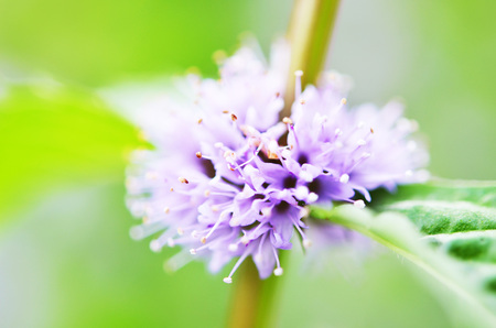 Mentha pulegium pennyroyal poles of light purple or pink flowers with long whitish stamens on a homogeneous deep green background flash lighting