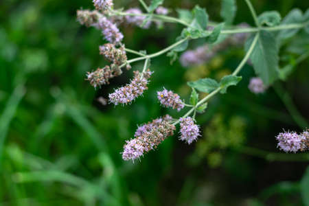 Fresh mint leaf with flowers. Herb leaves in Garden.