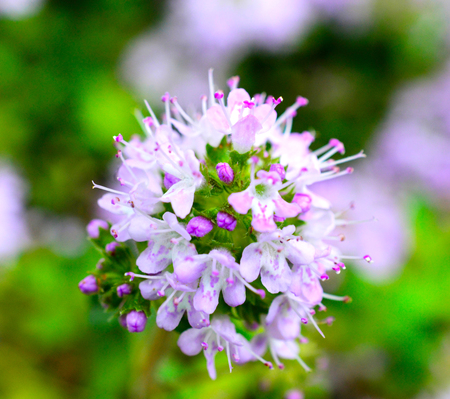 Spring blossom of pink aromatic kitchen herb thyme in garden close up