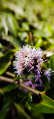 Lavender, puff-ball shaped wild flowers blooming in the mid-summer forest.