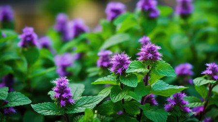 A serene close-up of a mint plant showcasing rich green leaves and delicate purple blossoms, set in a natural environment that highlights beauty and tranquility.
