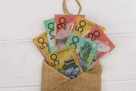 Australian dollar banknotes with material envelope on light background