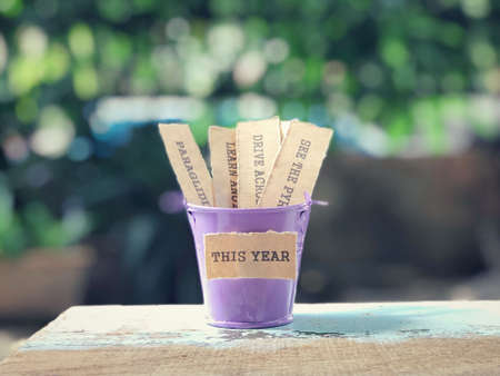 New Year resolutions concept - A bucket of lists on a wooden table.