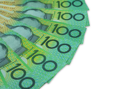 Australian dollar, Australia money 100 dollars banknotes stack on white background with clipping path.