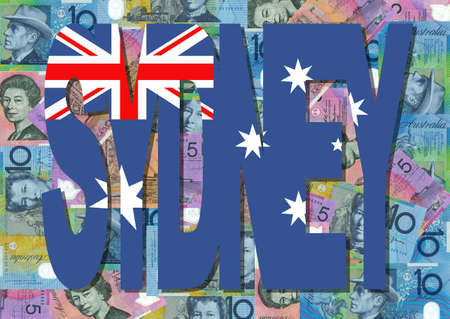 Sydney text with Australian dollar bills illustration