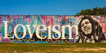 Miami, United States - July 29, 2019: Huge wall paintings adorn abandoned warehouses, stores and fences in the arts district of Wynwood Walls in Miami