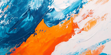 This dynamic abstract artwork features bold swirls and vibrant splashes of blue, orange, and white paint