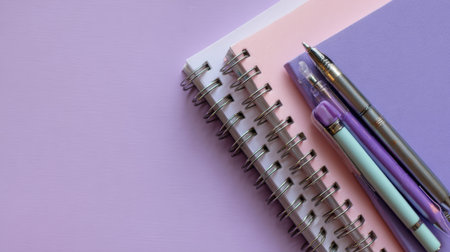 A spiral notebook lies open beside pens of various colors on a soft pastel background, creating a calming workspace ideal for creativity or study.