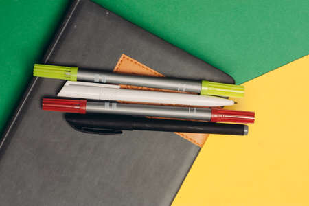 notepad pens and markers on yellow green background top view