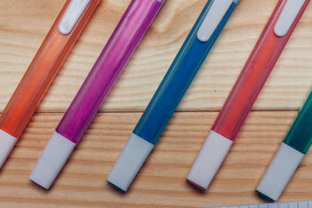 Multicolored gel ink pens on the wooden background