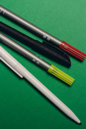 multicolored pens on a green background office supplies work stationery
