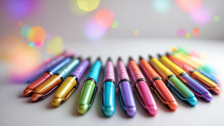 Colorful pens arranged in a vibrant line on a white surface surrounded by a blurred bokeh effect creating a cheerful atmosphere