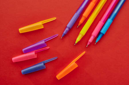 Colorful pens with caps closeup, red background
