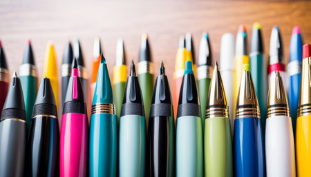 Close-up view of an array of colorful pens with various designs, representing a choice of writing instruments.. AI Generation