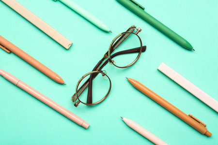 Stylish eyeglasses with stationery supplies on turquoise background